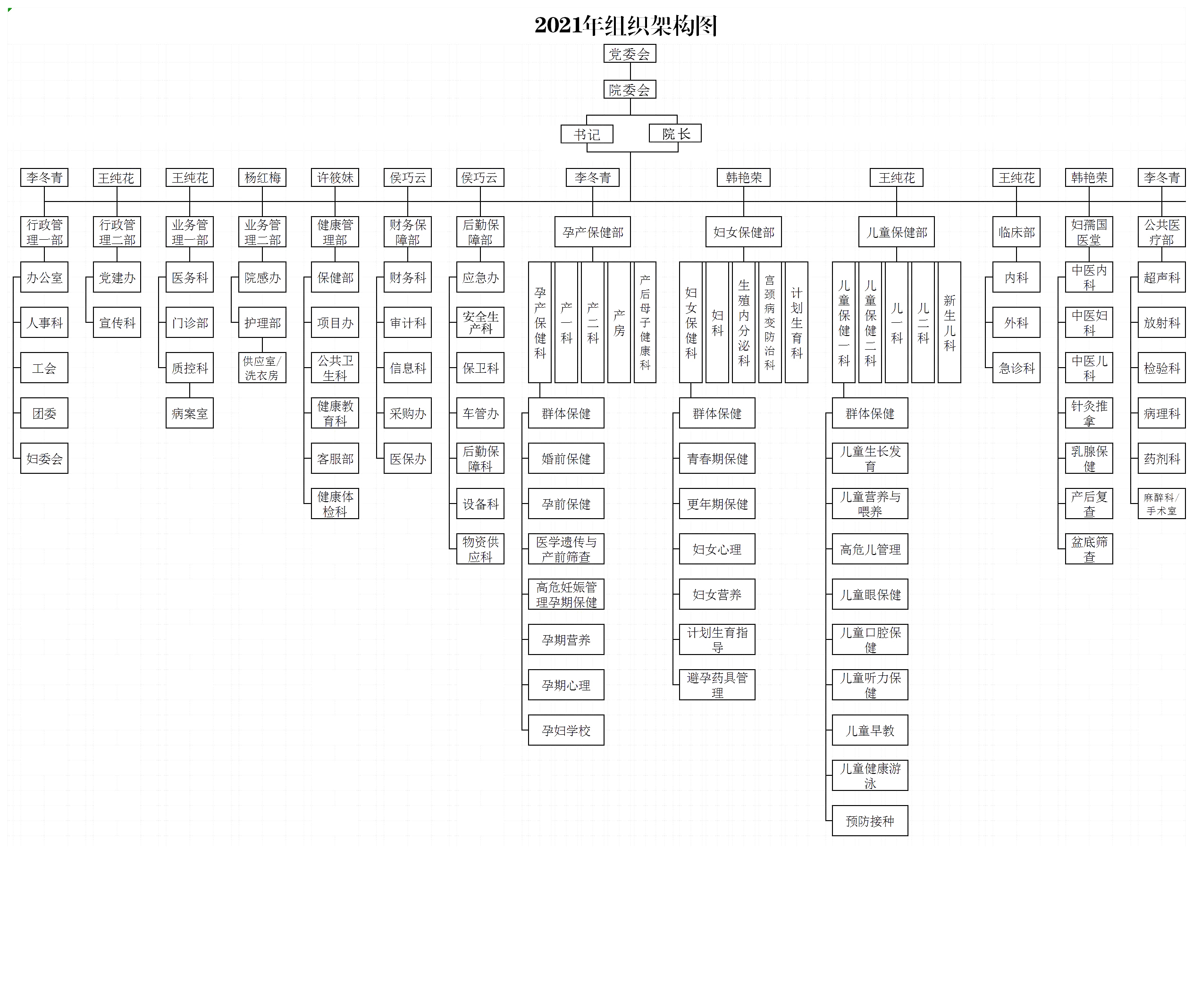 • 围产保健科 儿童保健科 妇女保健科 儿科 产科 妇科 内科 产房 超声科 儿童康复中心 宫颈病变防治中心 计划生育科 检验科 外科男科 生殖内分泌科 月子中心 中医妇科