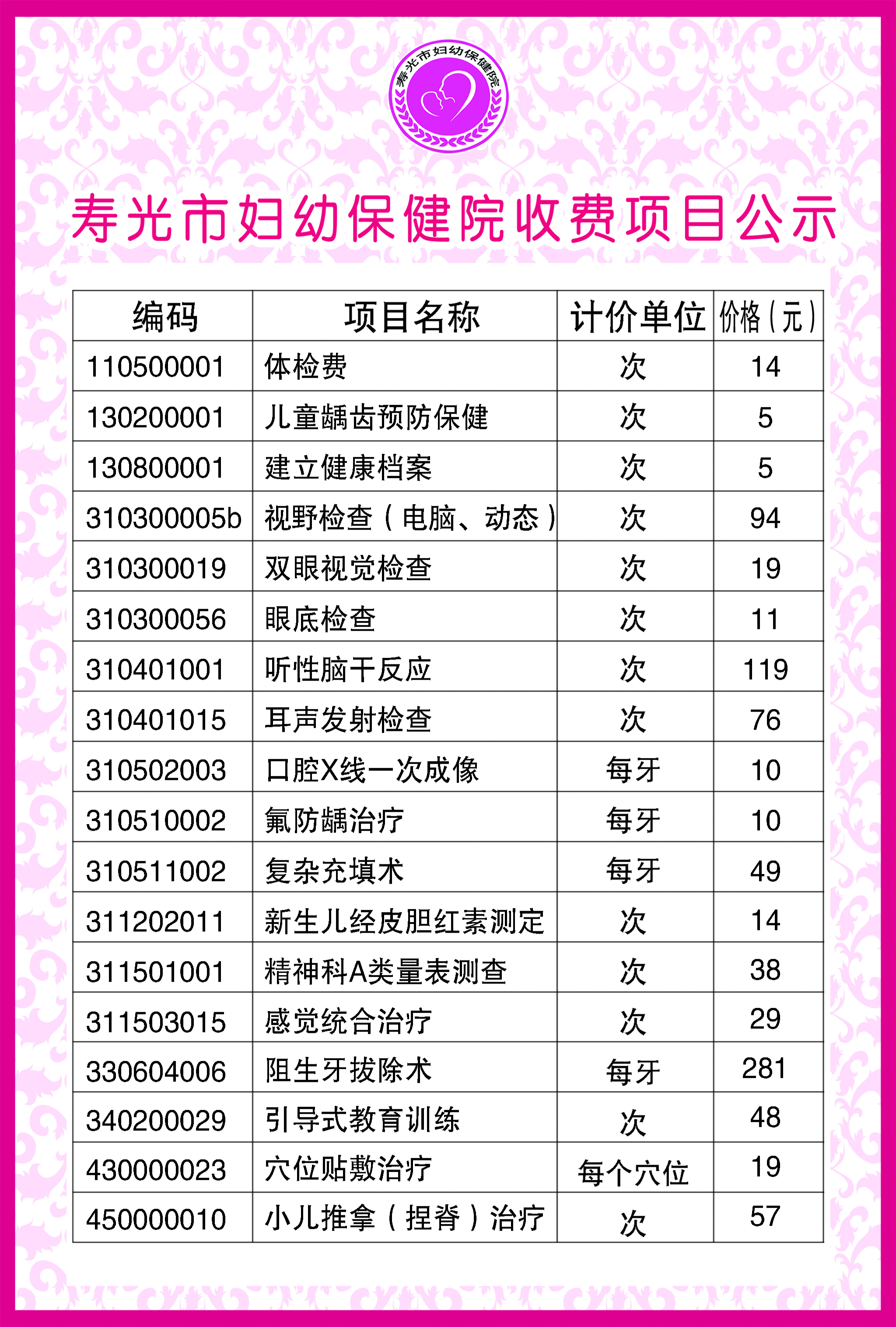 寿光市妇幼保健院收费项目公示